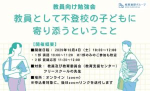 2025年10月4日(土)、不登校の児童生徒を持つ教員を対象としたオンライン勉強会「教員として不登校の子供へ寄り添うということ」を開催します。 文部科学省の令和5年度「児童生徒の問題行動・不登校等生徒指導上 […]