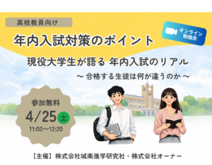 【高校教員向け】「現役大学生が語る年内入試のリアル ~合格する生徒は何が違うのか~ 」オンライン勉強会を 4/25(土)に開催します。