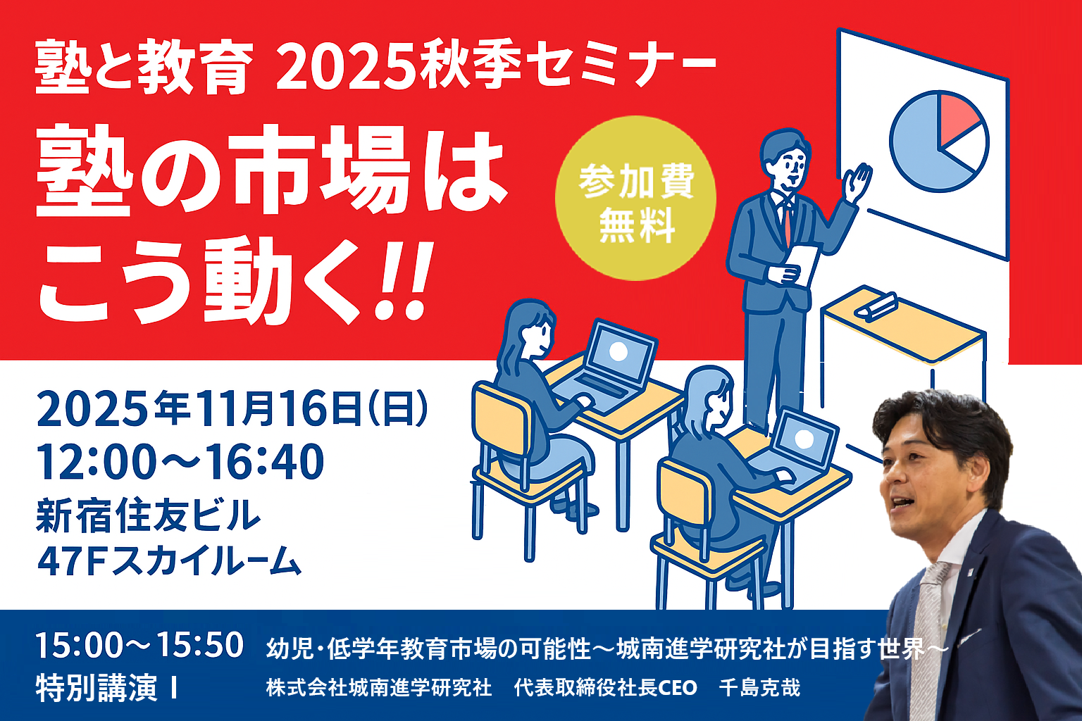 11月16日(日)、学習塾関係者の方々を対象にした「塾と教育」2025秋季セミナー『塾の市場はこう動く!!』に登壇します。